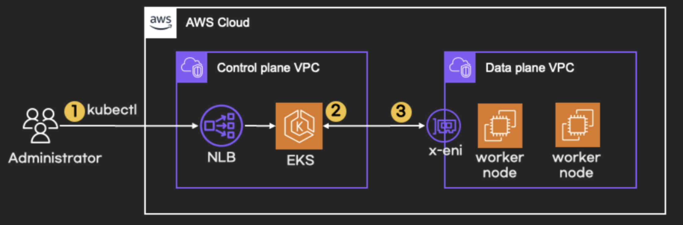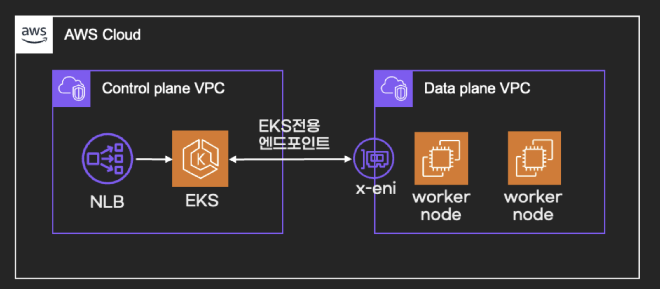 - EKS는 AWS가 직접 관리하는 Control plane VPC와 Data plane VPC가 있습니다.