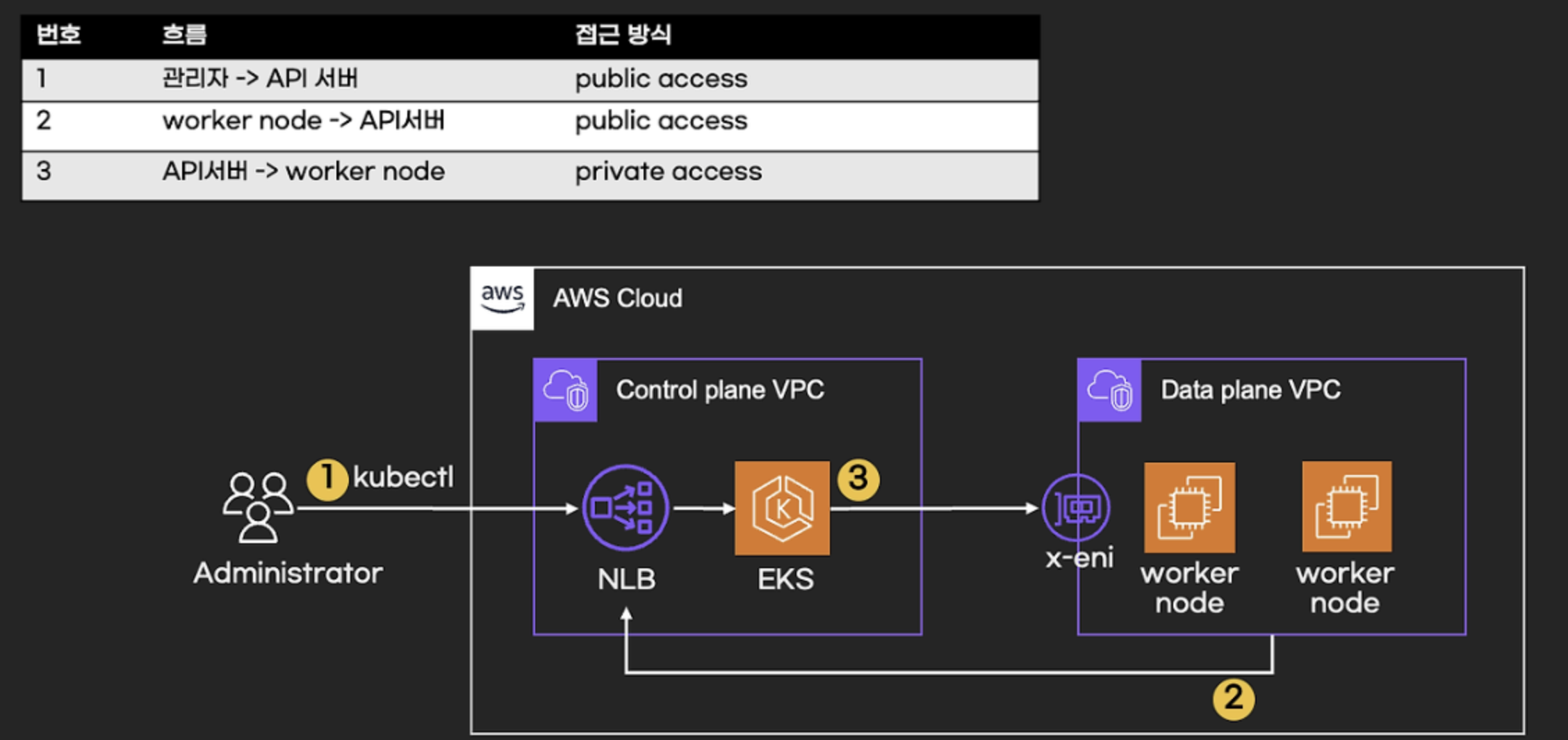 - kubectl 명령어를 사용하면 인터넷망으로 EKS 접근 가능