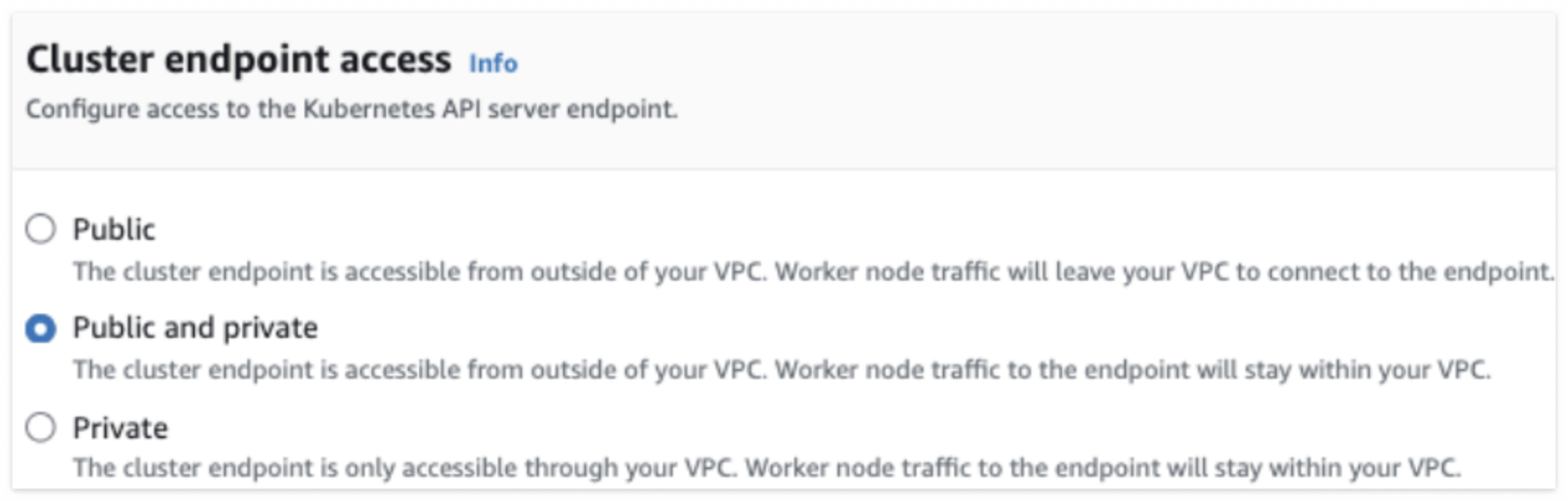 - 단순하게 생각하면 접근유형에 public이 들어가면 쿠버네티스 API서버 접근을 인터넷망으로 접근을 허용하겠다 입니다. 반대로 private만 있으면 인터넷망으로 쿠버네티스 API서버에 접근하지 못합니다.